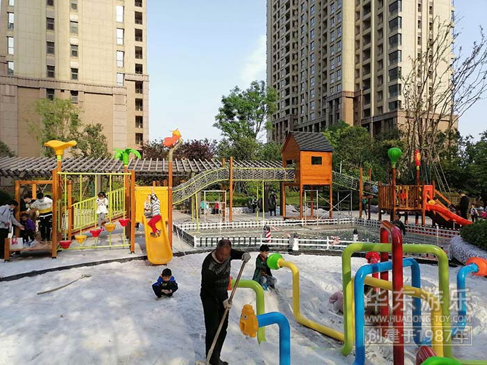 该项目采用非标定制木制工艺,有滑梯、沙池、传声筒 、爬网已经音乐系列的敲打设备,整体设计完美,符合房地产整体规划。