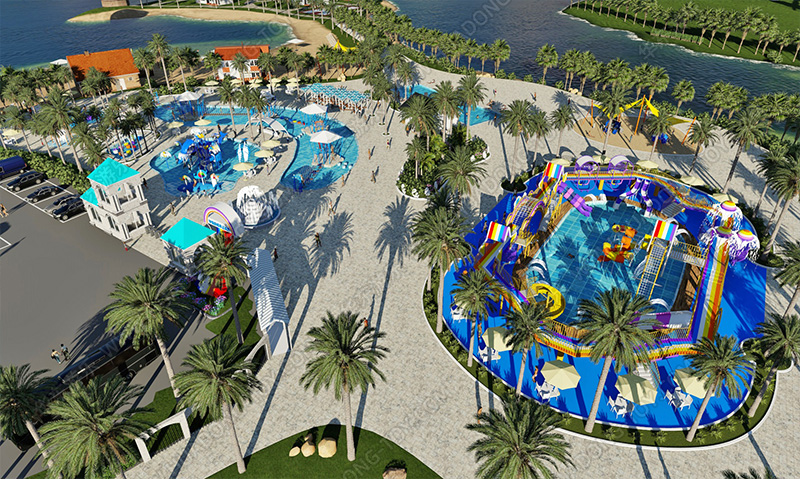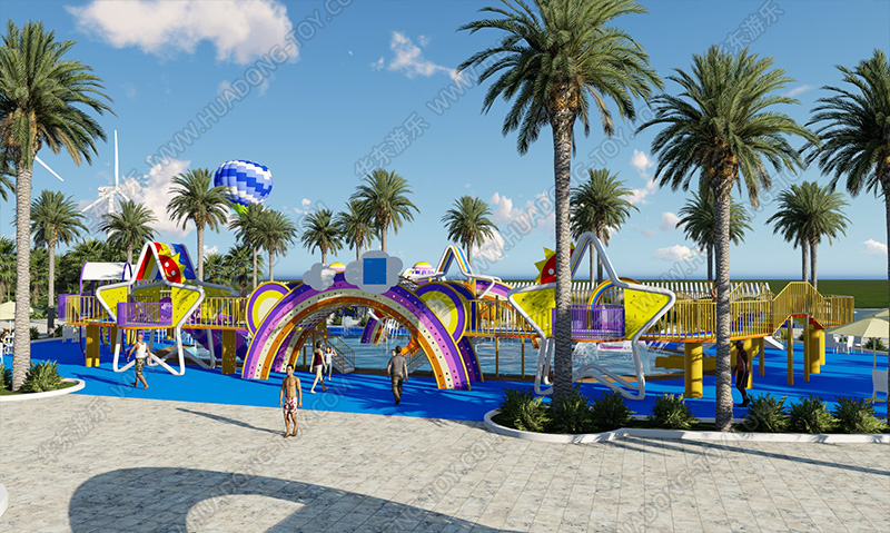 本案例设计灵感来源于天空中雨后的彩虹,这里充满的彩虹世界的斑斓世界,有五颜六色的的彩虹滑梯、色彩斑斓的彩虹桥,小朋友可以在彩虹中尽情的戏耍打闹,欢快的追逐天边的缤纷彩虹,整个水上乐园充满活泼奇特,色彩缤纷,在这里能够游泳,能够健身,让孩子们在玩的过程中激发了想象力,提高勇于挑战的勇气和游玩带来的欢乐!