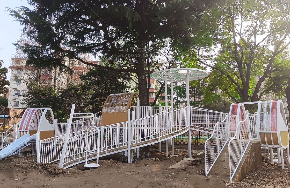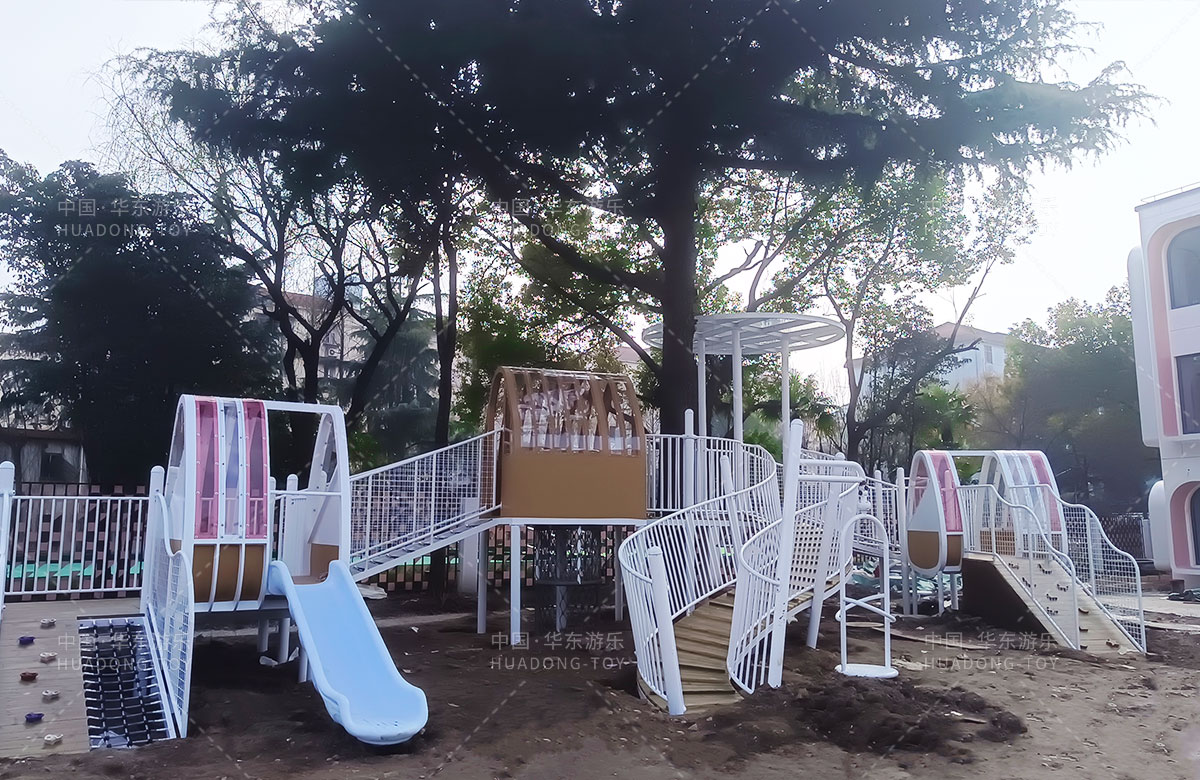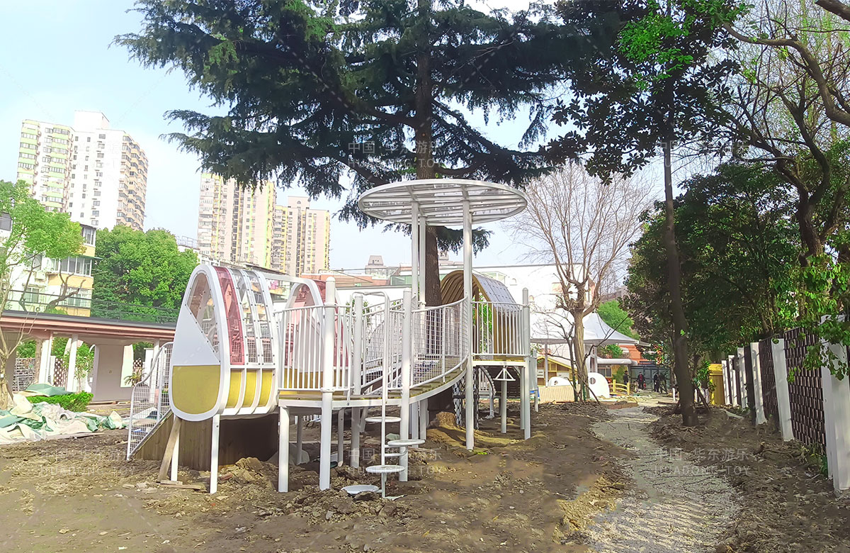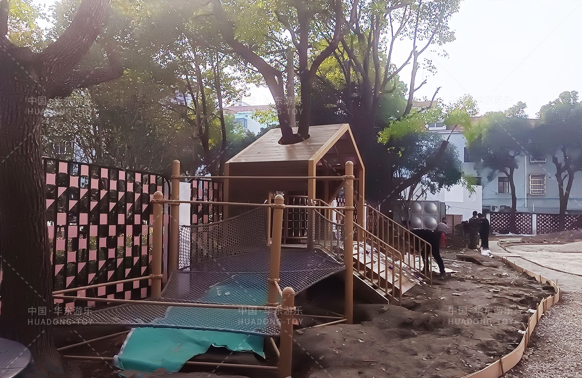 虹口区实验幼儿园简介创建于1993年9月。1994年定为一级一类幼儿园。儿园具有现代化的设施和美丽童趣的园舍。总占地面积4800多平方米。建设面积3000多㎡。绿化面积1800多㎡。 此次幼儿园游乐项目选择的是米兰·(milan)中国·运动游乐自主研发和设计的一款综合性木质系列非标定制产品,不仅功能齐全,主体性也非常的适合幼儿园的场景设置。